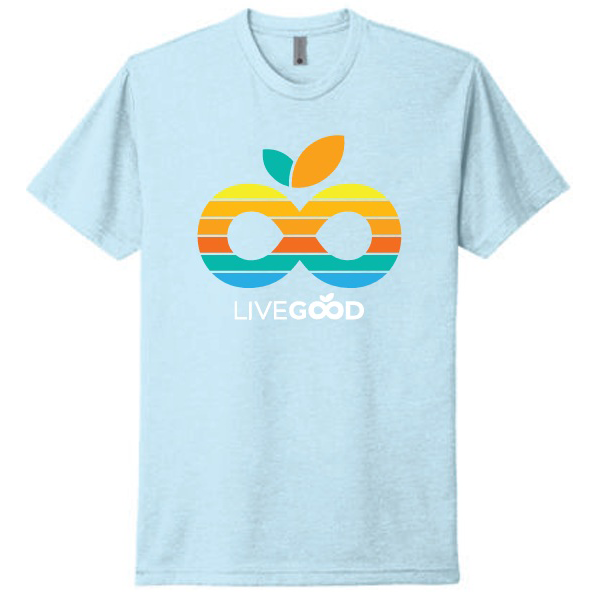 BRAND NEW LIMITED TIME TEE:  Ice Blue Next Level tee with colorful LiveGood infinite health symbol and logo.  Get yours while they last!